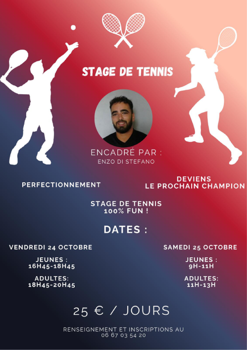 Nous organisons un stage de tennis 100% fun et perfectionnement encadré par Enzo Di Stefano ! 🏆